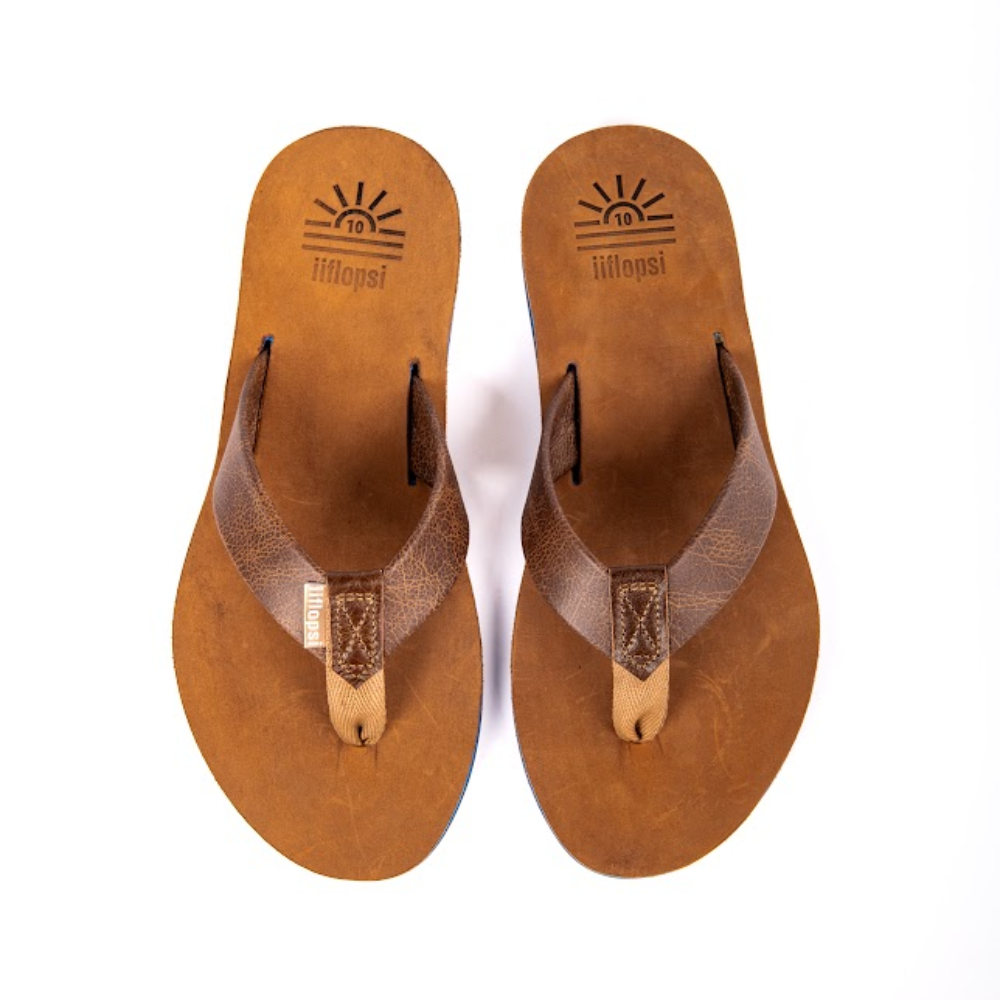 Our Full grain Castrol Tan leather Upper offers a soft touch with a walnut strap, Jungle Green mid sole, black inlay with a black rubber sole. This flip flop was designed as a fun all-rounder. It has no arch support.