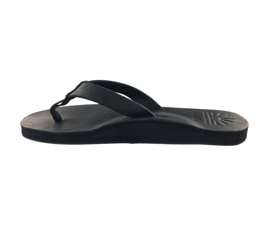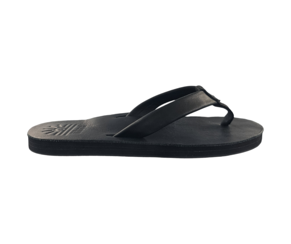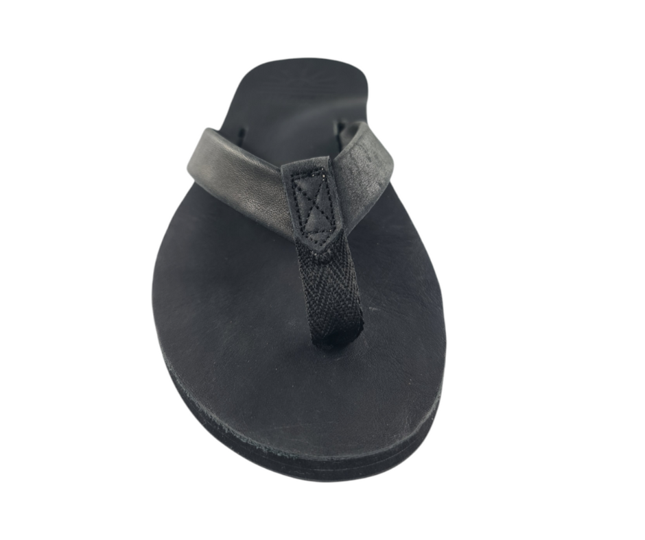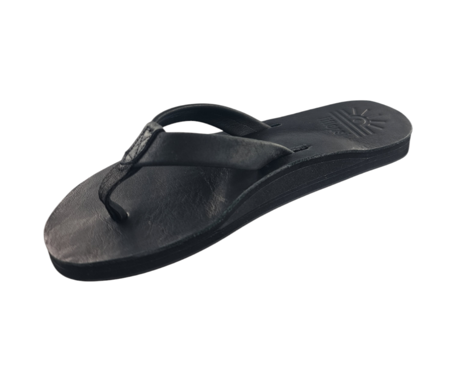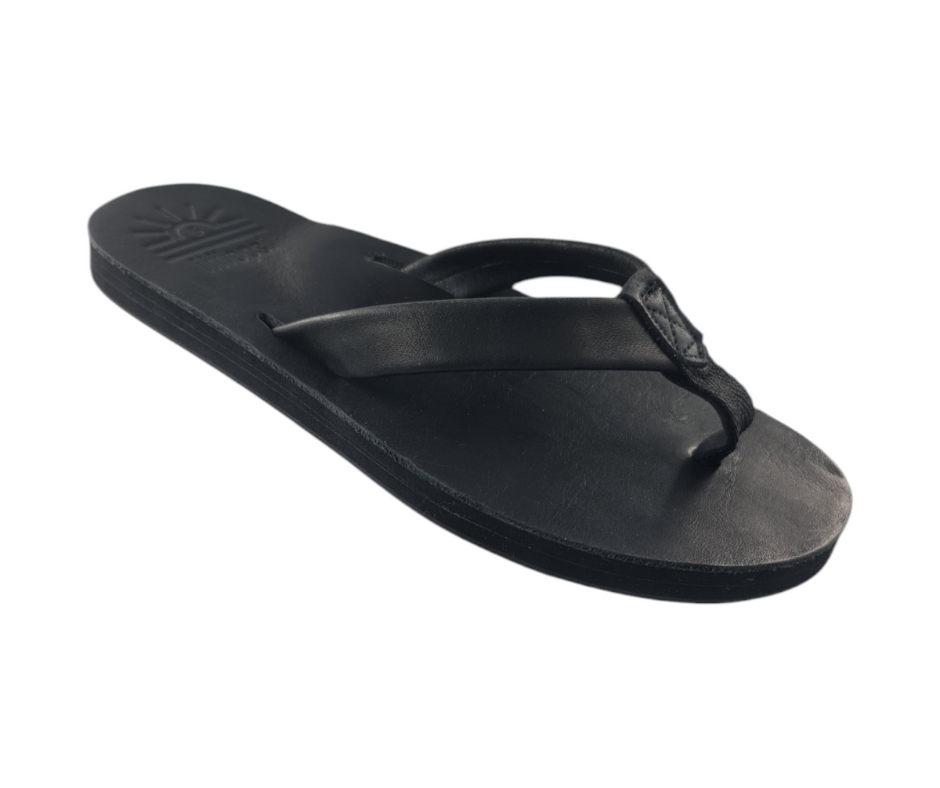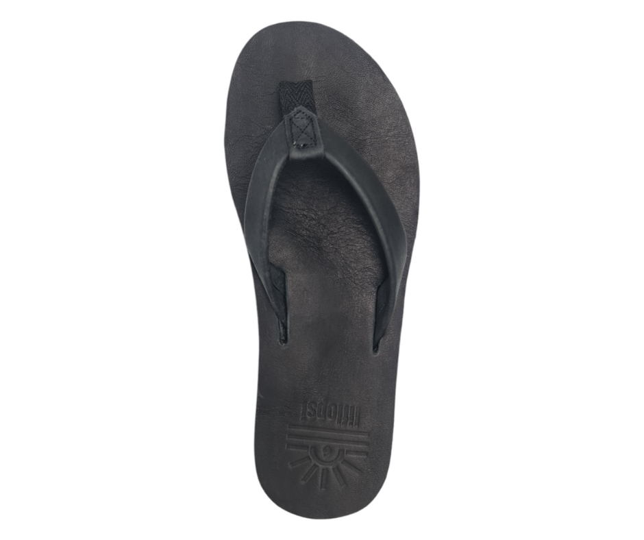 One of our most popular colours - our Black Mamba, for a more distinguished and refined look, this black leather is amazingly soft, and the strap is even softer, classic black cannot be left out and thank goodness it wasn't, it has really rounded of our range well. When you put your iiflopsi's on you know you are going for an adventure, one where you know your feet will have great comfort and support! A stylish ladies flip flop for everyday wear. Full grain upper, featuring a supper soft black straps and liners between your toes for additional comfort. We use a specifically developed and designed for purpose webbing that allows for stretch on the strap to fit like a glove with a fold to meet leather process to keep a high-end finish. Our flip flops are designed with a cushioned footbed that offers excellent arch support and comfort for all-day wear. Our flexible rubber outsole ensures reliable traction, making it perfect for a variety of surfaces, whether you're heading to the beach with friends or pottering around your house. With its combination of comfort, arch support and sleek design, our iiflopsi Black Mambas are a perfect go-to footwear for those who want both style, functionality and durability. All of our materials are sourced locally, and we hand make our flip flops out of our small factory in KZN.