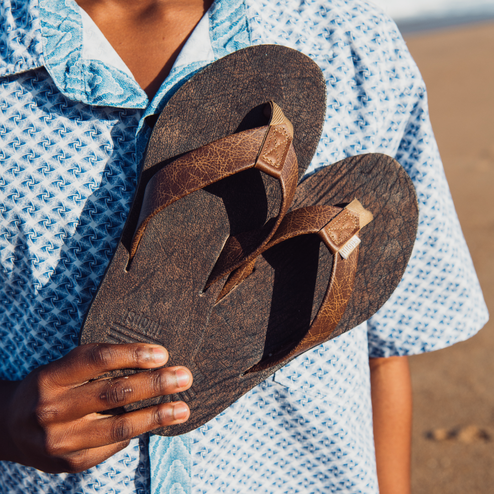 We wanted something truly South African, something that is truly unique, not only in the look, but in the feel too. After trialing a number of different types of exotic leathers, Genuine African Buffalo was the perfect fit! An extraordinary leather, very tough underneath and so very soft on the touch, perfect for a premium plakkie! We are very proud of our Buffalo Soldiers, and you will be too! These flip flops are designed with a cushioned footbed that offers excellent arch support and comfort for all-day wear. Its flexible rubber outsole ensures reliable traction, making it perfect for a variety of surfaces, whether you're heading to the beach with friends or going for a braai with family. With its combination of comfort, support, and sleek design, our iiflopsi Buffalo Soldiers are a perfect go-to footwear for those who want both style, functionality and durability. All of our materials are sources locally and we handmake each and every pair in our factory in KZN.