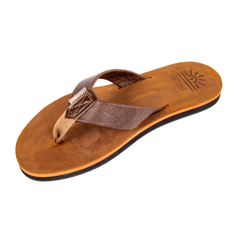 Our Full grain Castrol Tan leather Upper offers a soft touch with a walnut strap, Orange mid sole with a black rubber sole. This flip flop was designed as a fun all-rounder. It has no arch support.