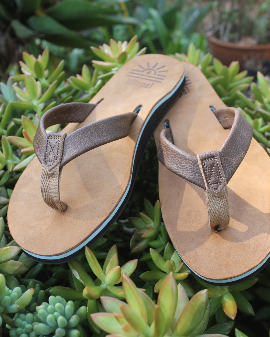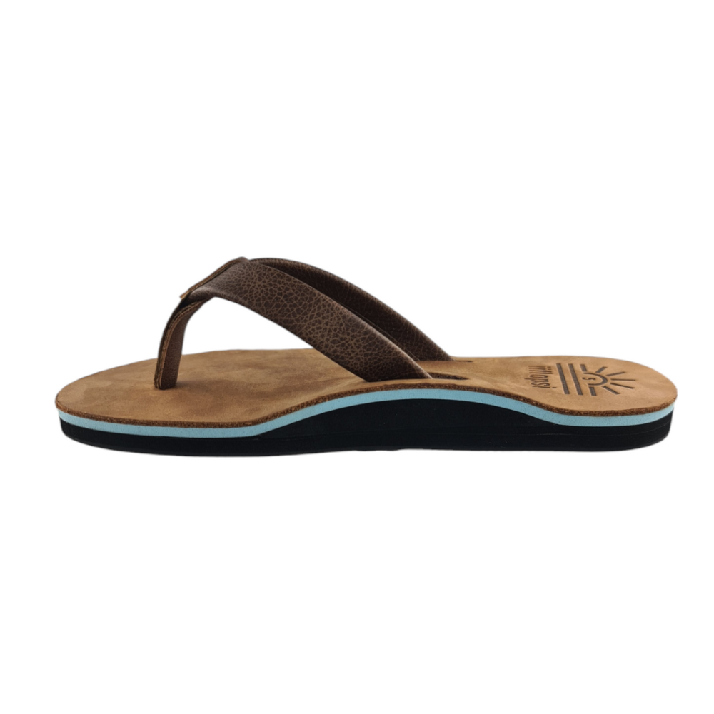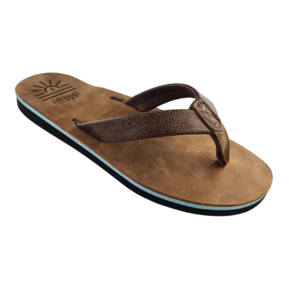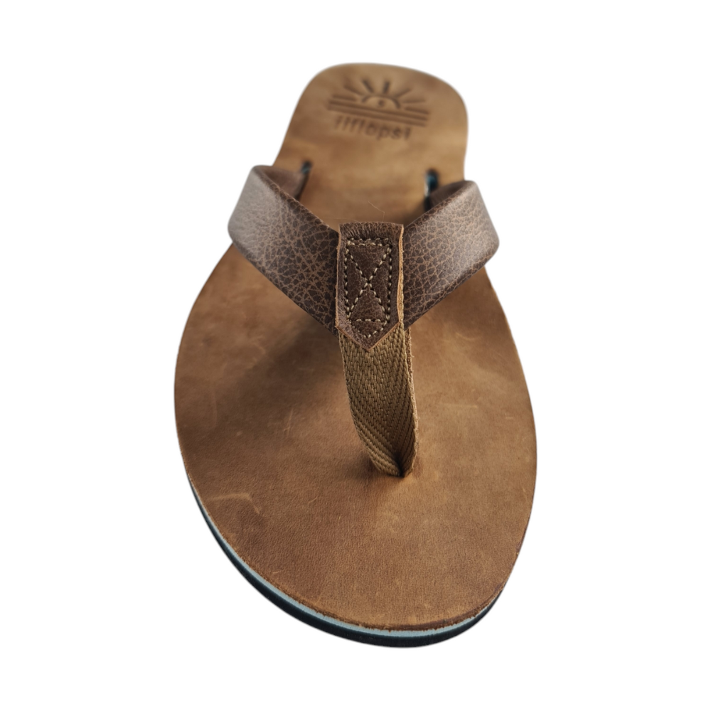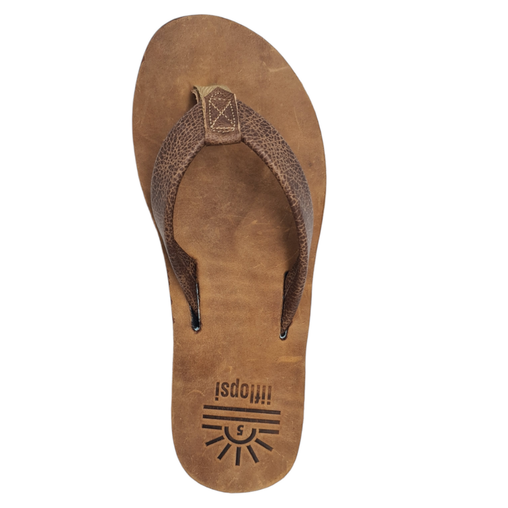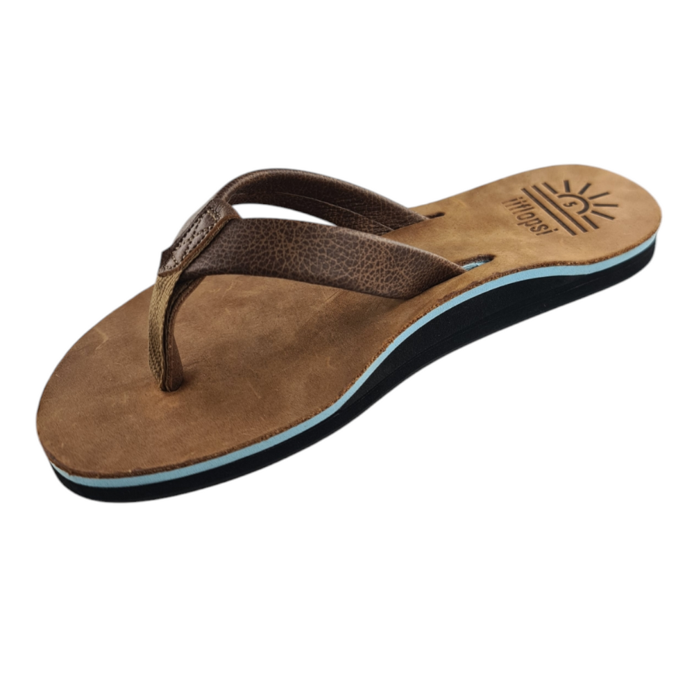 Our iiflopsi Ocean with a number of other colours in our ladies' range was inspired by summer! A different colour for a different day or mood. When you put your iiflopsi's on you know you are going for an adventure, one where you know your feet will have great comfort and support! A stylish ladies flip flop for everyday wear. A classic tan full grain upper, featuring a walnut strap and liner between your toes for additional comfort. We use a specifically developed and designed for purpose webbing that allows for stretch on the strap to fit like a glove with a fold to meet leather process to keep a high-end finish. Our flip flops are designed with a cushioned footbed that offers excellent arch support and comfort for all-day wear. Our flexible rubber outsole ensures reliable traction, making it perfect for a variety of surfaces, whether you're heading to the beach with friends or pottering around your house. With its combination of comfort, arch support and sleek design, our iiflopsi Oceans are a perfect go-to footwear for those who want both style, functionality and durability. All of our materials are sourced locally, and we hand make our flip flops out of our small factory in KZN.