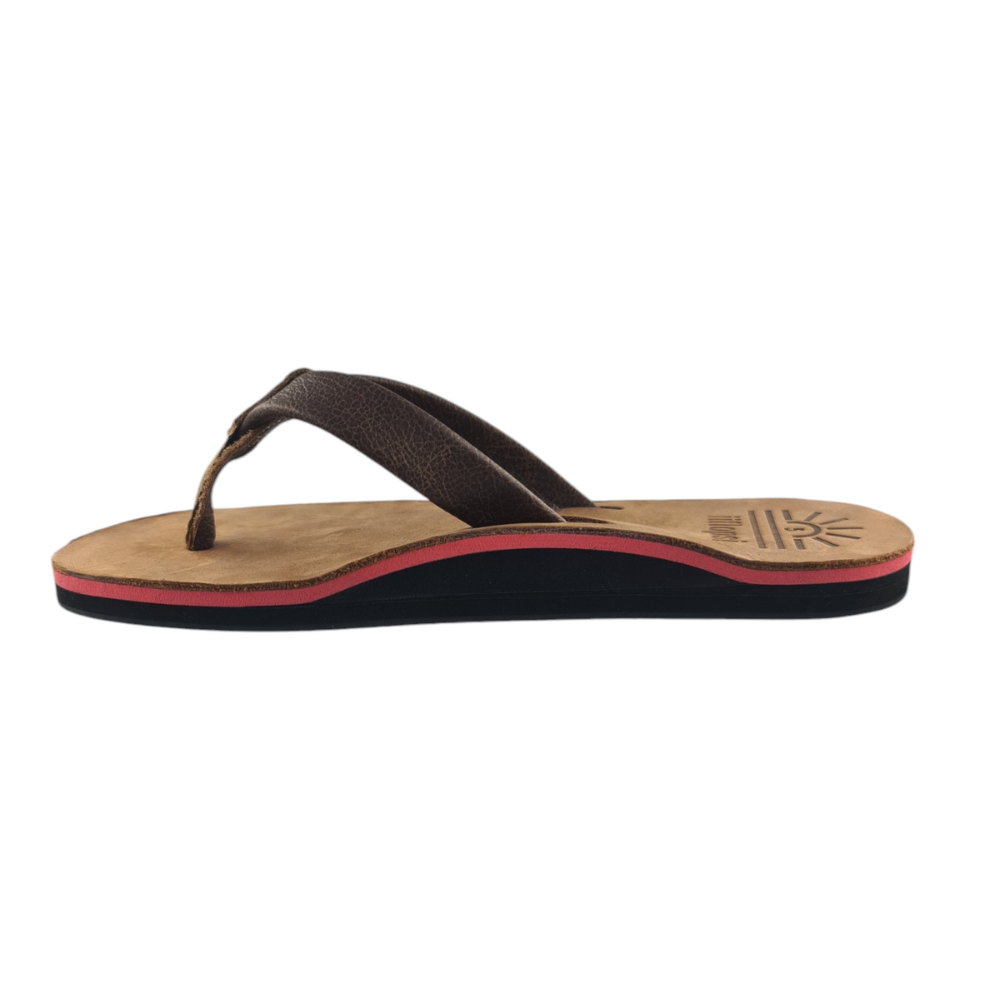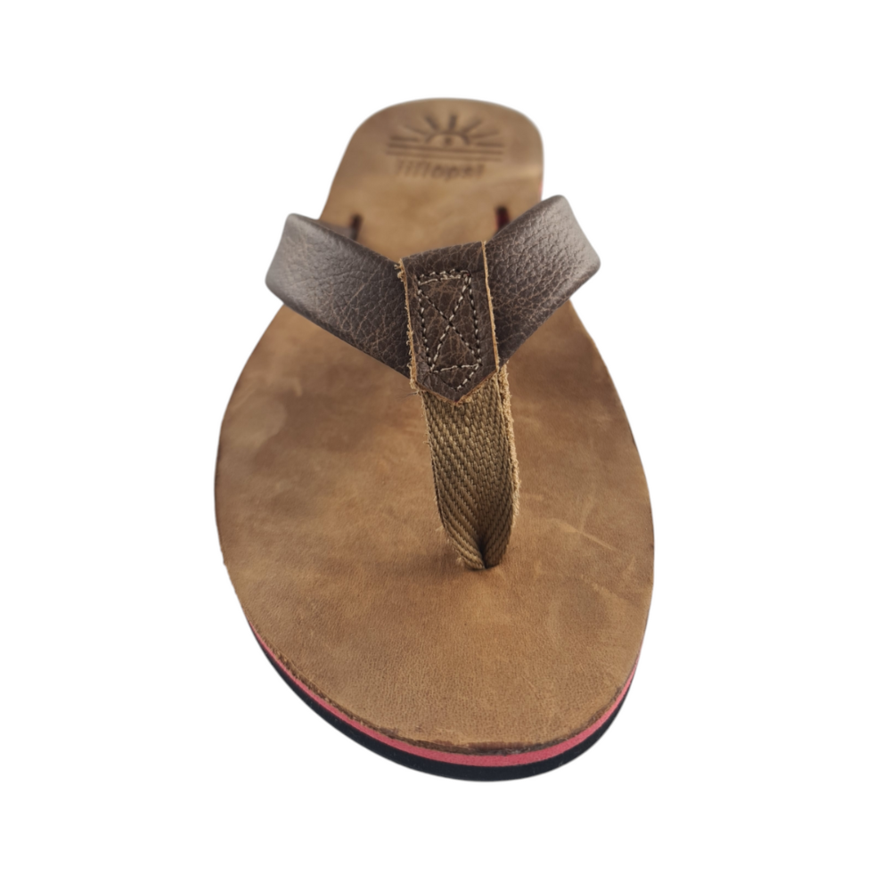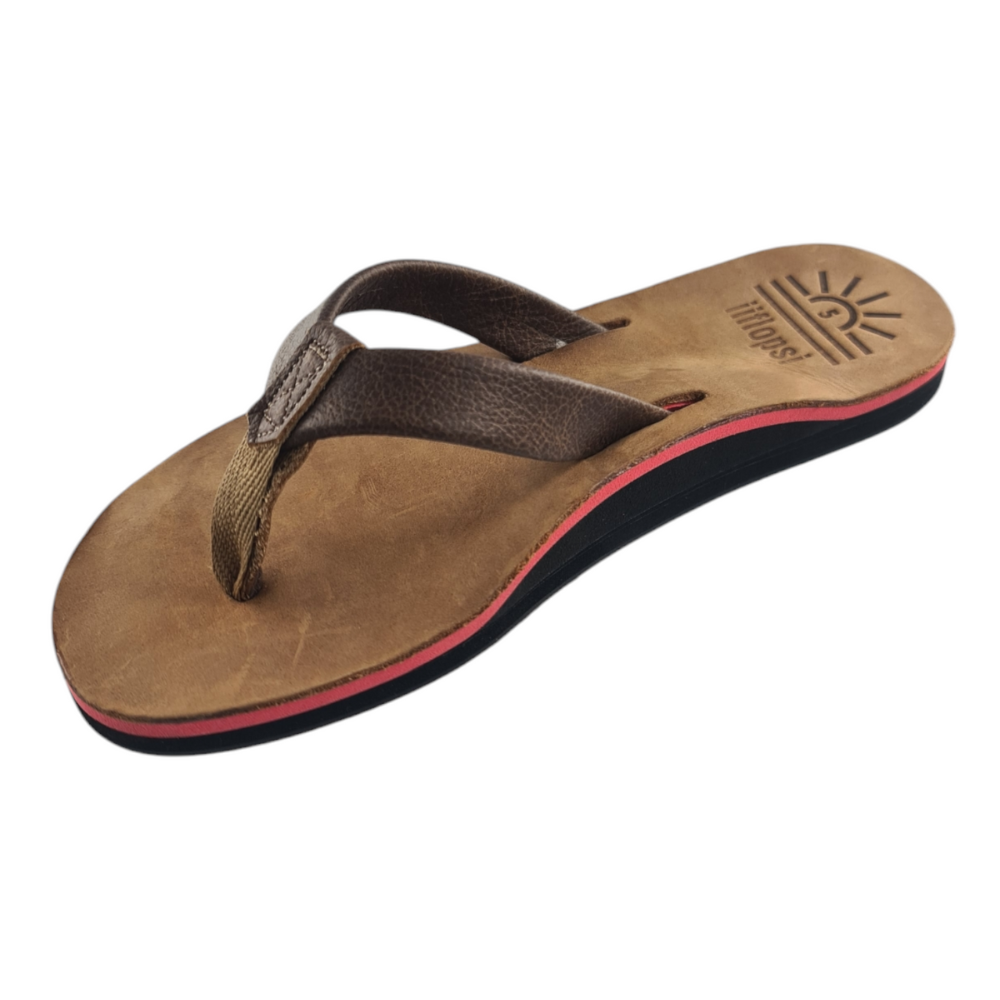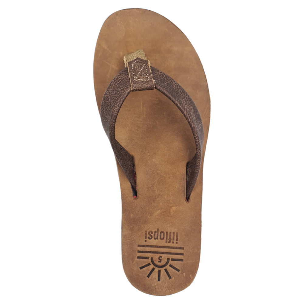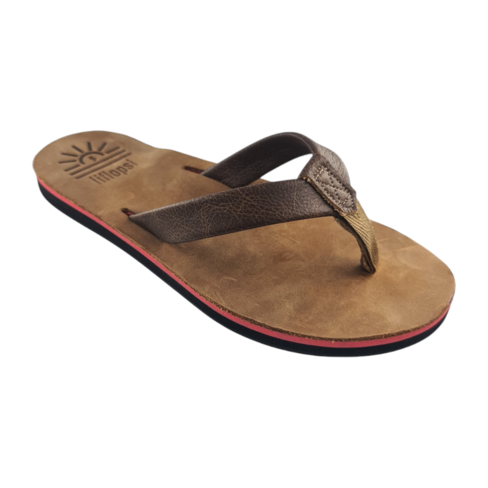 Our iiflopsi Peach with a number of other colours in our ladies' range was inspired by summer! A different colour for a different day or mood. When you put your iiflopsi's on you know you are going for an adventure, one where you know your feet will have great comfort and support! A stylish ladies flip flop for everyday wear. A classic tan full grain upper, featuring a walnut strap and liner between your toes for additional comfort. We use a specifically developed and designed for purpose webbing that allows for stretch on the strap to fit like a glove with a fold to meet leather process to keep a high-end finish. Our flip flops are designed with a cushioned footbed that offers excellent arch support and comfort for all-day wear. Our flexible rubber outsole ensures reliable traction, making it perfect for a variety of surfaces, whether you're heading to the beach with friends or pottering around your house. With its combination of comfort, arch support and sleek design, our iiflopsi Peaches are a perfect go-to footwear for those who want both style, functionality and durability. All of our materials are sourced locally, and we hand make our flip flops out of our small factory in KZN.